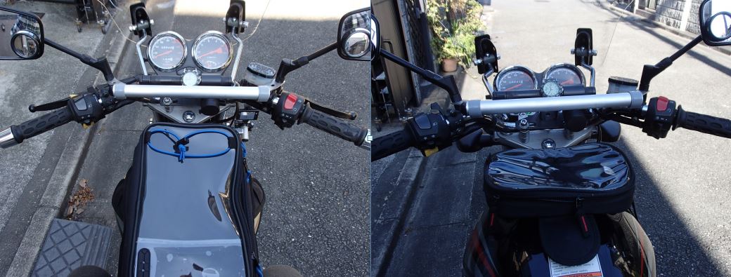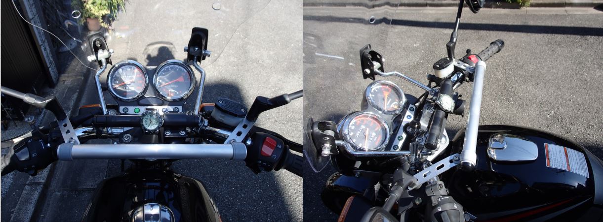 デイトナのクランプバーは車体の振動をモロに受けて、共振したときにはマッサージ機のような振動をしますが、新しいバーはアングルが緩衝材の効果を出しているのでしょう、そんな高速の振動は出ません。